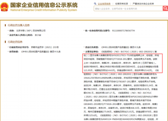 中国网财经梳理发现,今年3月,北京市朝阳区市场监督管理局对北京华联(SKP)百货有限公司罚款195798元,没收违法所得39832.43元。因其存在衣物抽检不合格等问题。