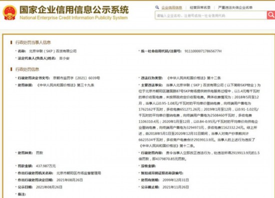 北京市朝阳区市场监督管理局表示,责令当事人立即改正违法行为,处违法所得2919913.9元的1.5倍罚款,即437.987万元罚款。