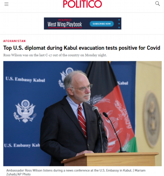海外网9月2日电美国“政治”网站1日报道称,三名知情人士透露,美国驻阿富汗大使馆代办罗斯·威尔逊新冠病毒检测呈阳性,目前有轻微的类似感冒的症状。他刚刚从喀布尔撤离。