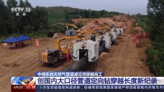 今天(9月2日),中俄东线天然气管道关键控制性穿越工程——滹沱河定向钻穿越工程——施工任务全部完成,本次完成的1219毫米管径定向钻穿越长度达1757米,创造了国内大口径管道穿越长度新纪录。
