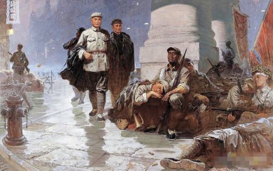 在画面中还有一些解放军战士,红旗上写着“人民子弟兵”字样,经过奋战,他们或坐或卧,有的战士身上还有鲜血渗出的血迹。