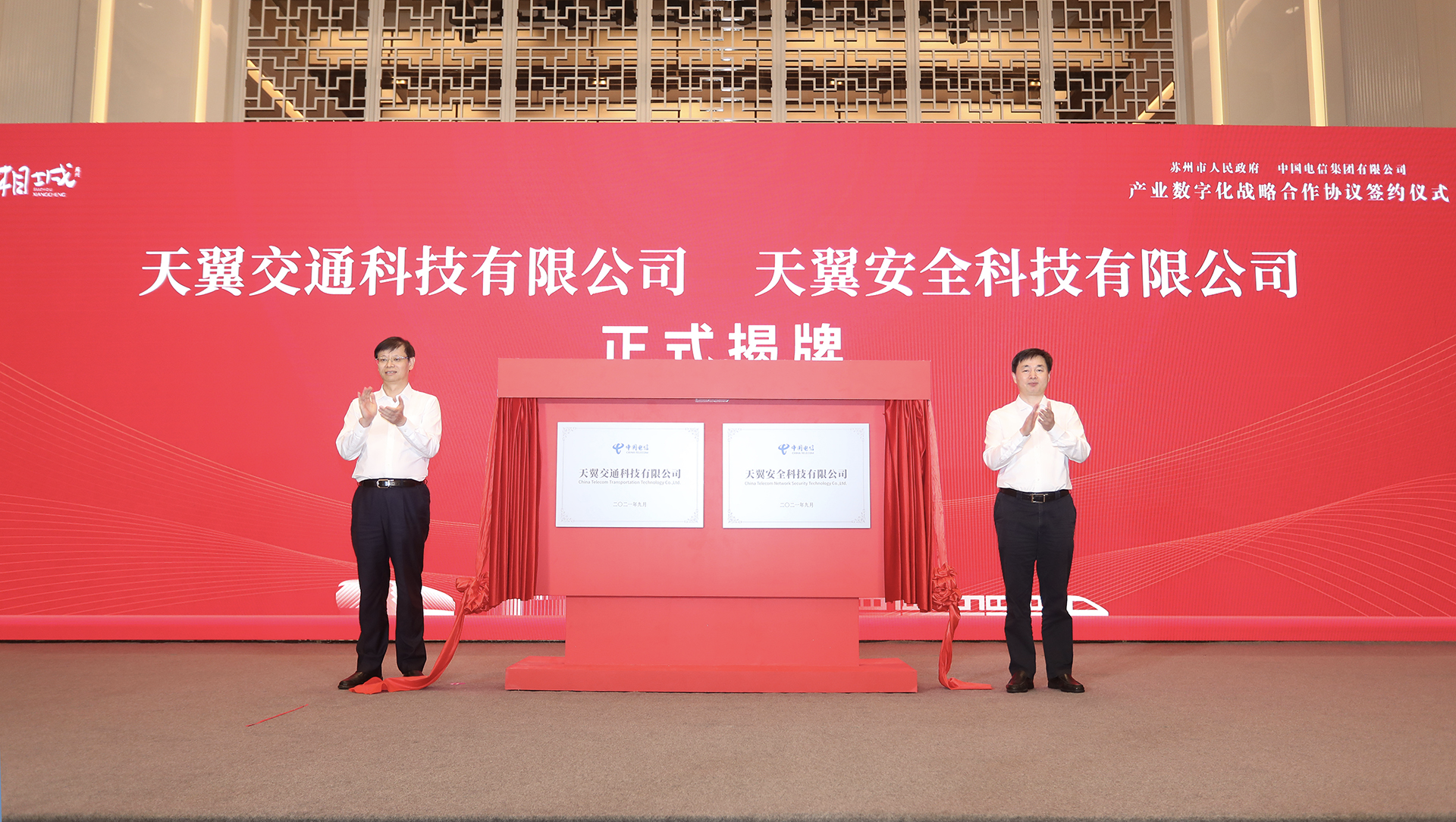 江苏省委常委、苏州市委书记许昆林,中国电信集团有限公司党组书记、董事长柯瑞文出席签约仪式并致辞,并共同为天翼交通科技有限公司、天翼安全科技有限公司揭牌。市委副书记、代市长吴庆文,中国电信副总经理唐珂出席活动。