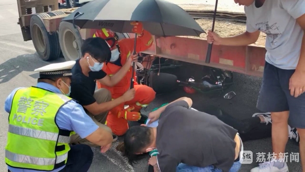 句容市消防大队宝华专职消防救援站站长胡高成告诉记者:“我们赶到现场时发现两名伤者躺在半挂车车底,救护车随后赶到现场,我们和城管跟医护人员一起帮忙把一名伤势严重的人员先抬上救护车送去医院进行治疗。”