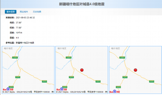 据中国地震台网消息,9月3日23时48分在新疆喀什地区叶城县(北纬37.86度,东经77.88度)发生4.0级地震,震源深度10千米。