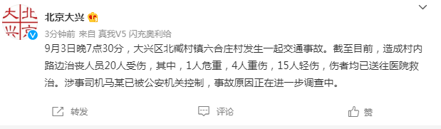 荔枝新闻讯,据“北京大兴”微博消息,9月3日晚7点30分,大兴区北臧村镇六合庄村发生一起交通事故。截至目前,造成村内路边治丧人员20人受伤,其中,1人危重,4人重伤,15人轻伤,伤者均已送往医院救治。涉事司机马某已被公安机关控制,事故原因正在进一步调查中。详情>>