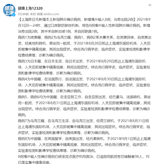 荔枝新闻讯 据“健康上海12306”微博消息,经荷兰转机,于2021年8月31日抵达上海浦东国际机场,入关后即被集中隔离观察,其间出现症状。综合流行病学史、临床症状、实验室检测和影像学检查结果等,诊断为确诊病例。