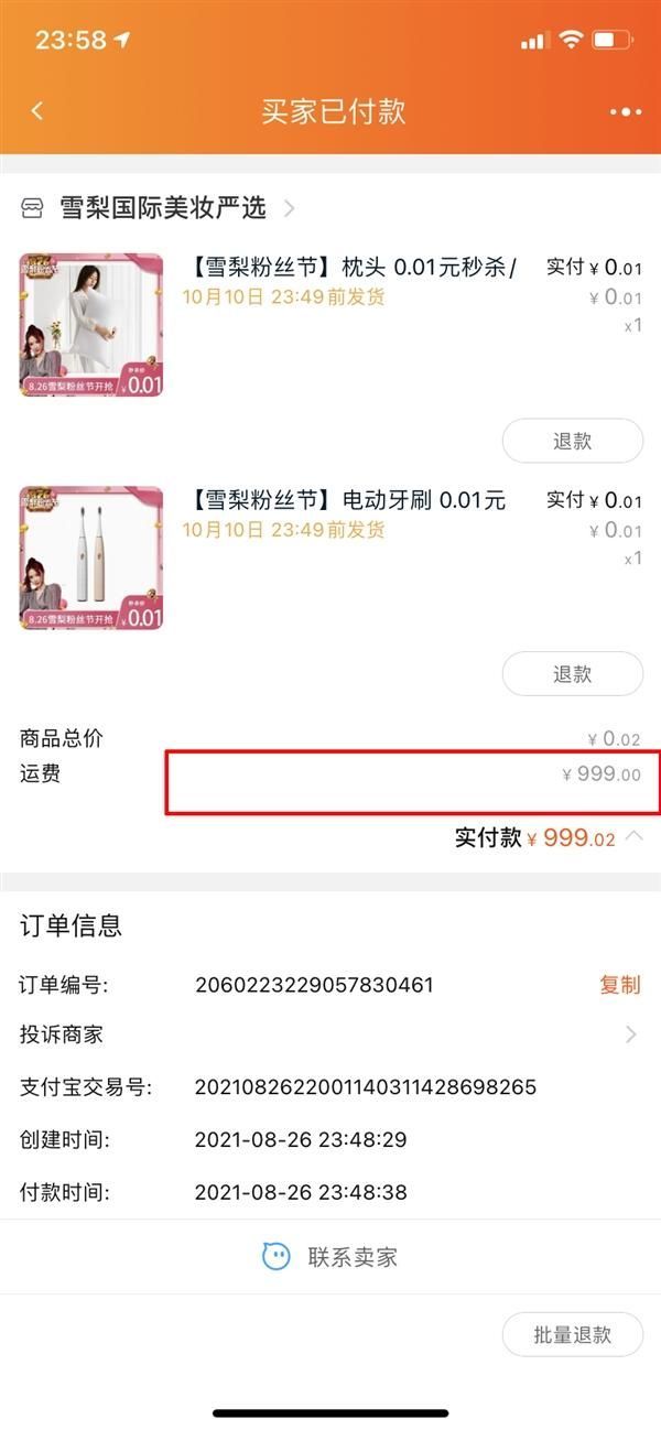 据极目新闻此前报道,河北石家庄的刘先生称,他8月26日在雪梨的直播间通过秒杀抢到1分钱的电动牙刷和1分钱的枕头,运费却高达999元。多名网友反映有类似的遭遇。