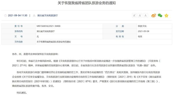 荔枝新闻讯 9月4日,湖北省文化和旅游厅官网发布《关于恢复我省跨省团队旅游业务的通知》称:即日起,全省各旅行社及在线旅游企业恢复经营跨省团队旅游及“机票+酒店”业务。全文如下——