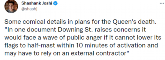 “女王去世计划中的一些有趣细节。‘在一份文件中,唐宁街对此表示担忧,如果他们无法在计划启动后10分钟内降半旗,它将面临公众的愤怒浪潮。’”↓
