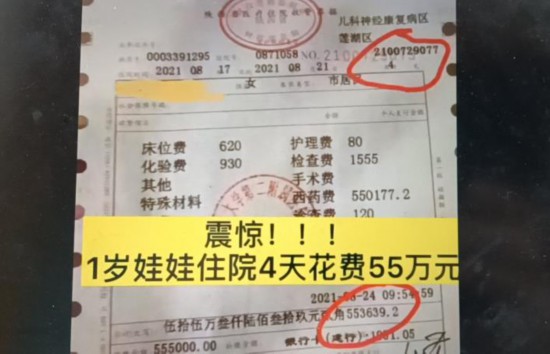 央视网消息(记者 王甲铸)一个一岁小女孩住院4天花费55万,什么病会花费这么高?近日,一张西安交通大学附属第二医院儿科神经康复病区住院收费票据在网上传播。票据显示,一名由该院小儿内科收治的1岁幼女8月17日开始住院,8月21日出院,4天时间总共花费553639.2元,有网友因此质疑医院高收费“收割”病人,称“这哪是什么花钱如流水,简直是洪水”。