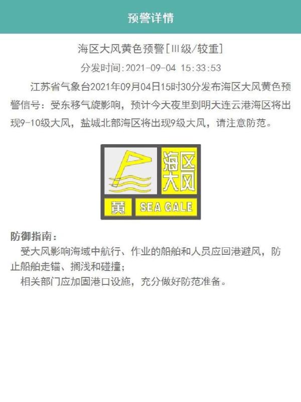 江苏省气象台2021年09月04日15时30分发布海区大风黄色预警信号:受东移气旋影响,预计今天夜里到明天连云港海区将出现9-10级大风,盐城北部海区将出现9级大风,请注意防范。
