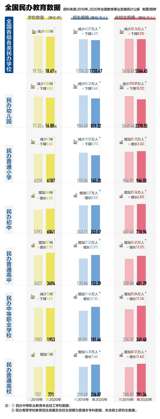 经过二十多年的发展,民办教育在公办教育之外已经形成了一个巨大的体量。据2020年全国教育事业发展统计公报,全国共有各级各类民办学校18.67万所,占全国比重34.76%,在校生5564.45万人。