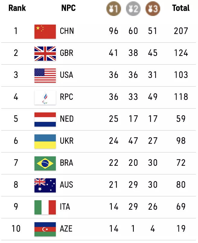 今天,中国体育代表团结束了本届残奥会所有比赛项目,以96金60银51铜的成绩雄踞金牌榜和奖牌榜榜首,这也是中国体育代表团连续第五次位列夏季残奥会金牌榜和奖牌榜双第一!