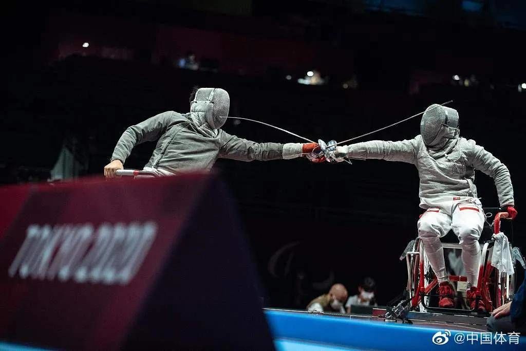轮椅击剑男子花剑个人B级决赛,开放大学选手冯彦可和胡道亮会师决赛,最终冯彦可一剑“封喉”,15-14险胜队友胡道亮,成功卫冕。胡道亮获得银牌。