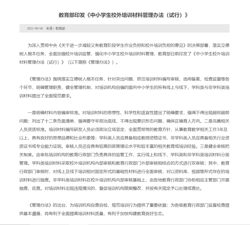 据教育部网站消息,为深入贯彻中央《关于进一步减轻义务教育阶段学生作业负担和校外培训负担的意见》的决策部署,落实立德树人根本任务,全面加强校外培训监管,强化中小学生校外培训材料管理,教育部日前印发了《中小学生校外培训材料管理办法(试行)》(以下简称《管理办法》)。