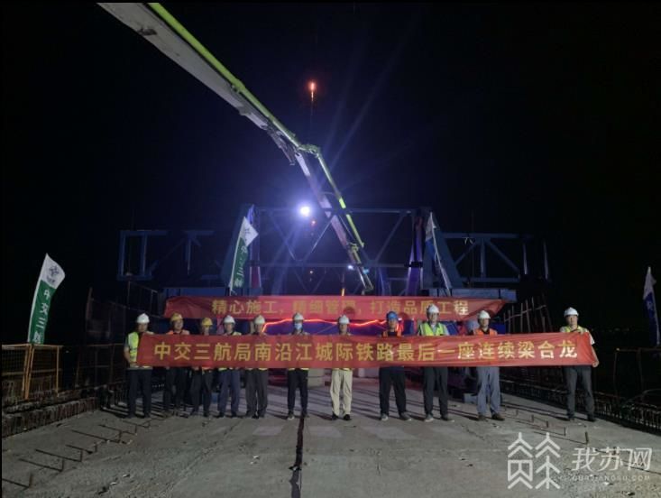 9月6日23点08分,随着白茆河大桥跨白茆塘连续梁顺利浇筑完成并合龙,南沿江城际铁路常熟段高架19联连续梁全部完工,意味着苏州常熟段在全线率先完成线下(墩台和连续梁)主体结构施工,常熟段建设项目重难点、控制性工程取得新突破,为后续推进箱梁架设及桥面施工奠定了坚实基础。