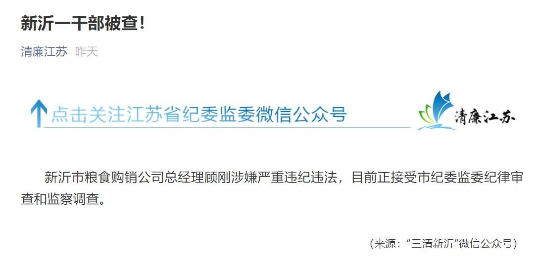 新沂市粮食购销公司总经理顾刚涉嫌严重违纪违法,目前正接受市纪委监委纪律审查和监察调查。