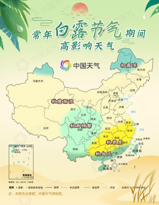 常年白露节气期间,北方冷空气活动频繁,大部地区秋意渐浓,华北将在此时节完成入秋进程,黄淮地区也全面开启夏秋转换;而在南方,特别是江南、华南地区还需警惕秋老虎,暑热还未真正消退。在西北地区东部及西南地区,是华西秋雨最为旺盛的时节,往往出现连绵的阴雨天;在华南沿海,则需警惕秋台风的影响。