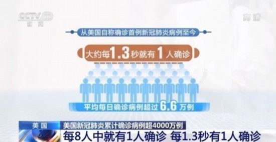 从美国自身来看,累计确诊病例超过4000万,这意味着每8个美国人中就有1个人确诊。从时间上来讲,从美国自称确诊首例新冠肺炎病例至今,平均每日确诊病例超过6.6万例,也就是说大约每1.3秒就有1人确诊。