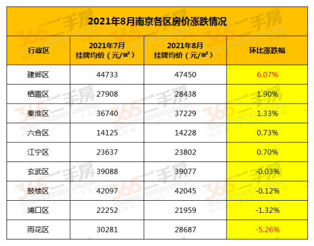 扬子晚报/紫牛新闻记者注意到,在南京本土的地产机构统计中,当地的8月份二手房挂牌价仍维持上涨态势。据365淘房的统计数据,8月全市的二手房挂牌价为35009元/㎡,环比上月的34643元/㎡涨幅为1.06%。南京的9大区域中,仅建邺区和雨花台区的涨跌幅比较明显,其中建邺上涨6.07%,雨花台下跌5.26%,其他各区的涨跌幅都在2%以内。从挂牌价上看,全市最高的区域仍属建邺,8月挂牌均价达到47450元/㎡,最低的是六合区,挂牌均价为14228元/㎡。