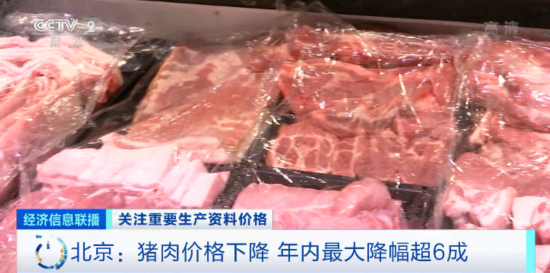 在北京东四环的一家超市,记者看到货架上的猪肉品类多达30多种,工作人员表示,所有的品类目前价格都出现了下调。自年初到现在,猪前腿肉从19元降到12元,降幅接近40%;五花肉由50元下降到25元,降幅为50%。