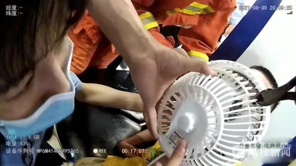 走近仔细一看,原来是小男孩的牙套卡在了风扇前网罩和导风轮装饰盖的缝隙中。
