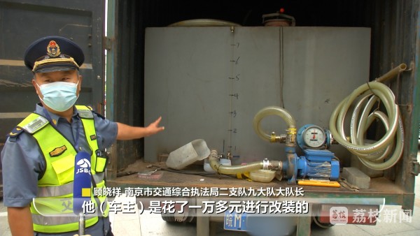 南京市交通综合执法局二支队九大队大队长顾晓祥表示,“这辆厢式货车的车主是花了一万多元进行改装的。有储油罐,能装六吨多油。有抽油的泵、计量的仪器。”在车内,执法人员没有看到任何安全设施,比如灭火器或是防静电装置。