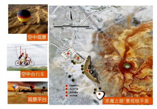 茫崖市文体旅游广电局相关负责人表示,最终,通过近一周的考察设计,最终《“千载古驿,一眼万年”》设计方案成功获选一等奖,该方案规划以沙丘为意向进行景区160米的观景台设计俯瞰“恶魔之眼”,观景台周围布置无人机拍摄,热气球定点观光、空中自行车等高空项目,同时观景台出口附近建造VR研学体验馆,让游客观看艾肯泉一年四季不同时刻的美丽风景。