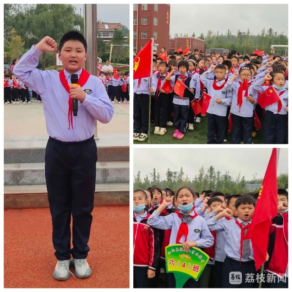 六(6)班刘浩田同学向同学们发出倡议:树立远大目标,坚定理想信念;立足全面发展,认真学习知识。郑重有力的誓言,彰显着新时代中国少年儿童的志气、骨气、底气。