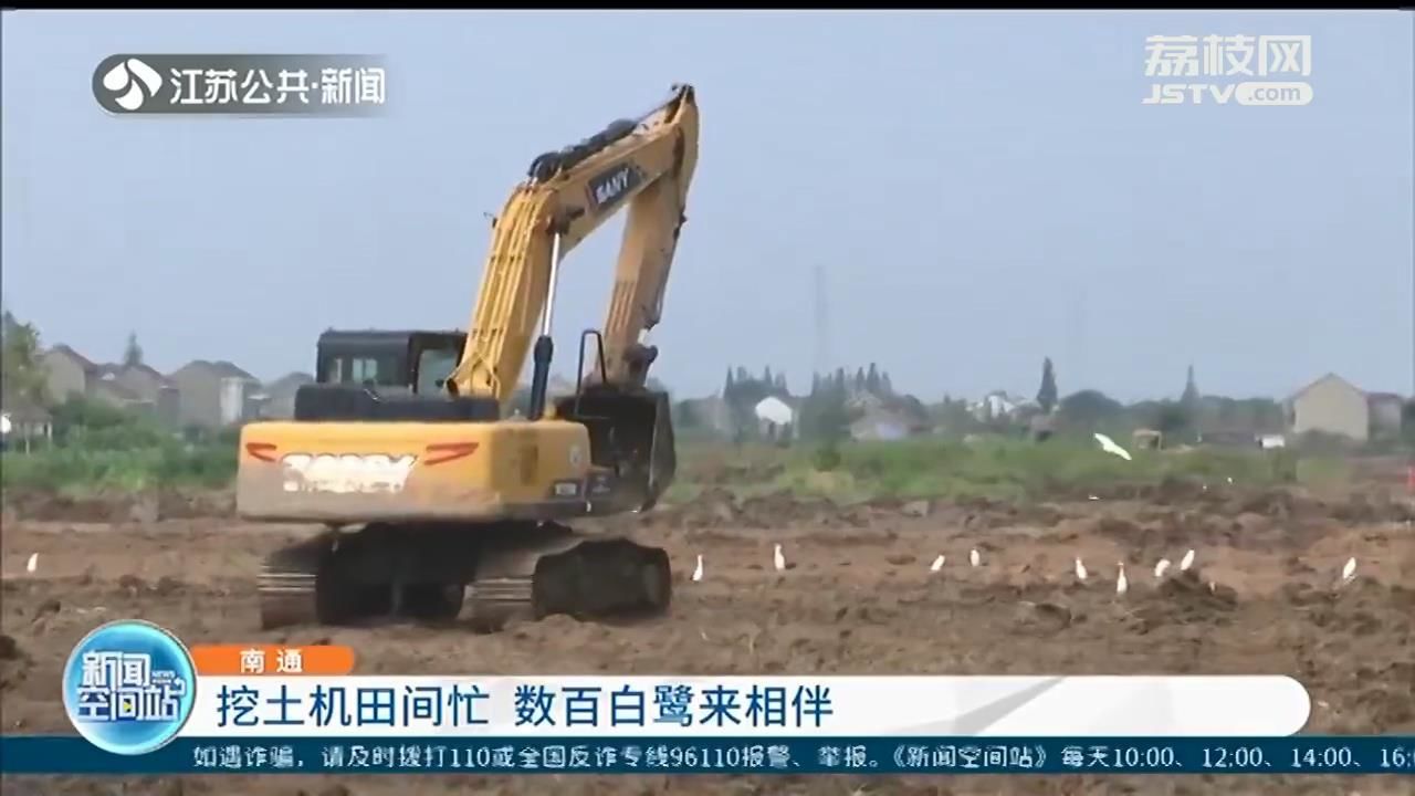 在南通市海门区悦来镇,挖土机、拖拉机正在给几十亩土地翻土。机械隆隆的声响中,数百只白鹭翩跹而至,气定神闲地围绕在旁,不时在刚翻新的土地里上下翻飞,快乐地享受一场饕餮盛宴。