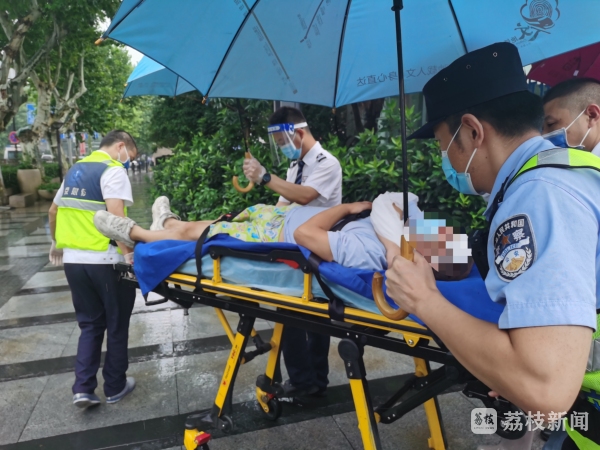 身旁的热心乘客见状赶紧向警方及工作人员求助。经检查,王先生的额头和小腿处有不同程度的出血和肿胀,右臂无法动弹,工作人员迅速安抚其情绪,并进行先期救助。约20分钟后120赶到,众人携手将其移至担架,送往救护车。一路上王先生疼痛到眉头紧锁,但依旧不忘向警方、车站工作人员和120急救人员连连道谢。后经回访得知,王先生右臂轻微骨折,需按医治疗。