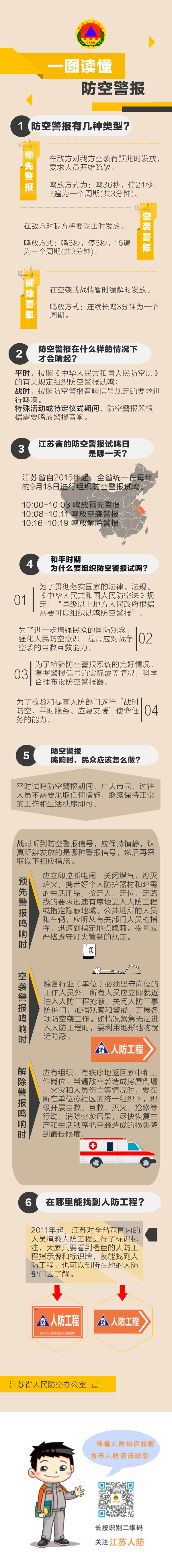 记者从江苏省人民防空办公室了解到,为贯彻落实《中华人民共和国人民防空法》,经江苏省政府同意,9月18日组织全省第七次防空警报统一试鸣。