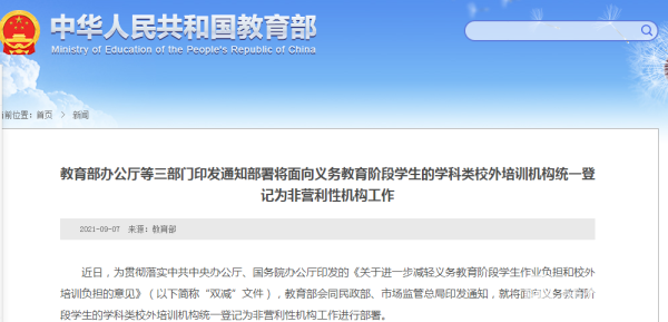 《面向义务教育阶段学生的学科类校外培训机构统一登记为非营利性机构工作进行部署》中提到:2021年底前完成面向义务教育阶段学生的学科类校外培训机构统一登记为非营利性机构的行政审批及法人登记工作,培训机构在完成非营利性机构登记前,应暂停招生及收费行为。