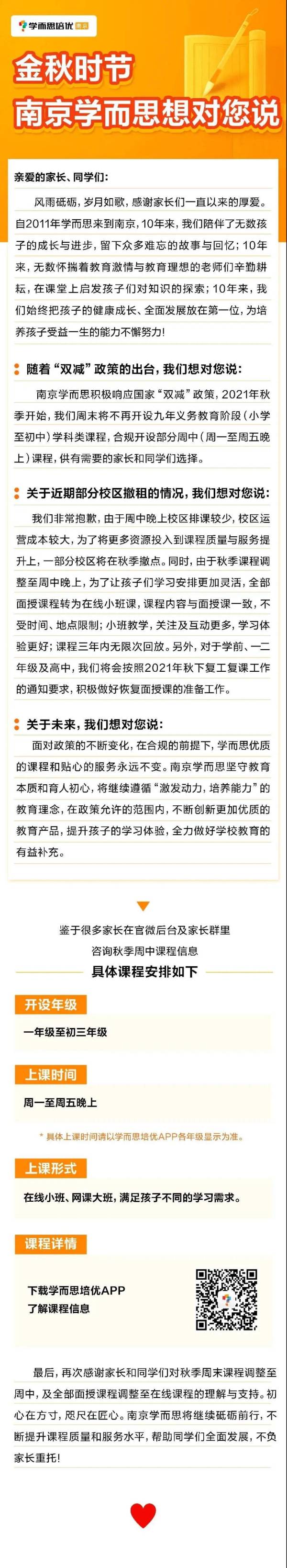 记者在南京学而思官方公众号上看到,通知写着:随着“双减”政策的出台,南京学而思积极响应国家“双减”政策,2021年秋季开始,周末将不再开设九年义务教育阶段(小学至初中)学科类课程,合规开设部分周中(周一至周五晚上)课程,供有需要的家长和同学们选择。