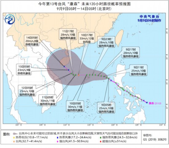 今年第13号台风“康森”(强热带风暴级)的中心今天(9日)凌晨进入南海中部偏东海域,早晨5点钟位于我国海南省三沙市西沙永兴岛东偏南方向约700公里的海面上,中心附近最大风力10级(25米/秒),中心最低气压985百帕。预计,“康森”将以每小时15公里左右的速度向偏西方向移动,强度逐渐加强,最强可达强热带风暴级或台风级(10~12级,28~33米/秒),11日转向西北方向移动,逐渐向我国广东西部到海南岛南部一带沿海靠近,强度逐渐减弱(见图1)。9日08时至10日08时,南海中部海域及西沙群岛、中沙群岛和黄岩岛附近海域有7~8级大风,台风中心经过的附近海域和地区风力可达9~11级,阵风12~13级。