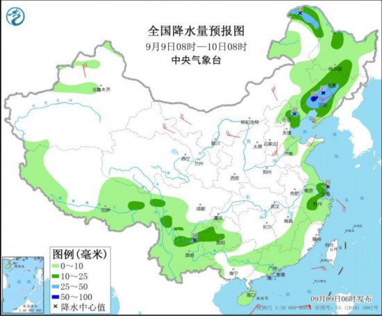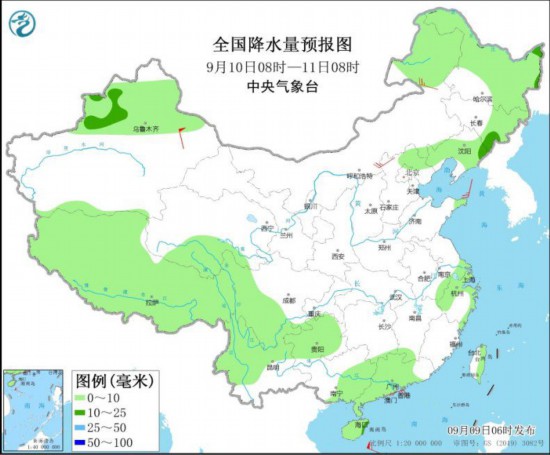 图2 全国降水量预报图(9月9日08时-10日08时)