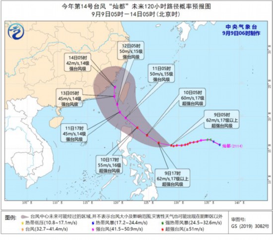 此外,今年第14号台风“灿都”(超强台风级)的中心今天(9日)早晨5点钟位于我国台湾省鹅銮鼻东南方向约1090公里的洋面上,中心附近最大风力有17级以上(62米/秒),中心最低气压为915百帕。预计,“灿都”将以每小时20公里左右的速度向西偏北方向移动,强度变化不大或略有减弱,尔后转向西北方向移动,穿过巴士海峡向我国粤闽一带沿海靠近,也可能擦过台湾岛东部沿海向北移动(见图1)。