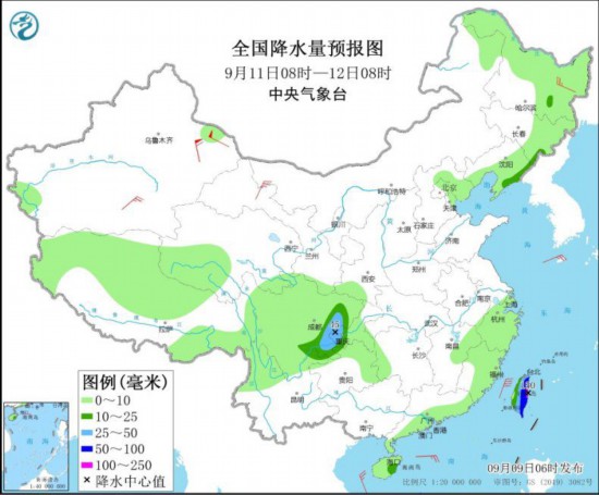 图4 全国降水量预报图(9月11日08时-12日08时)