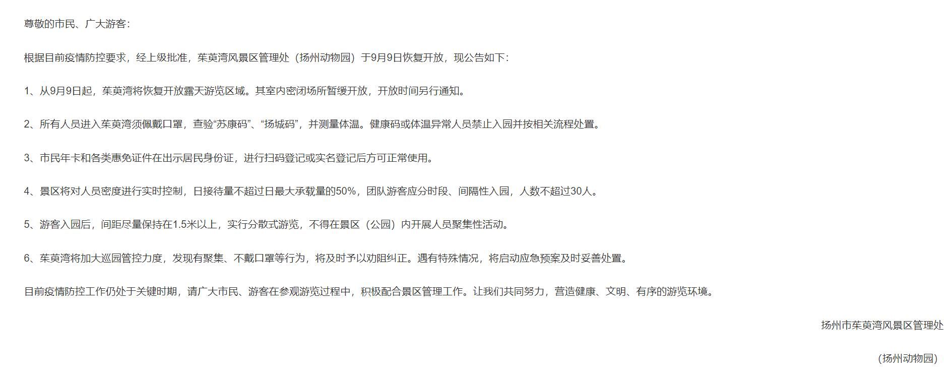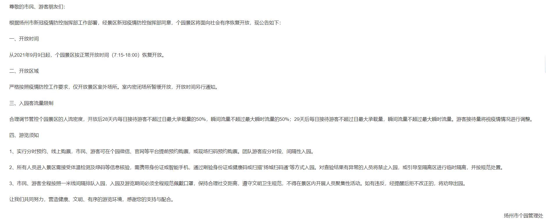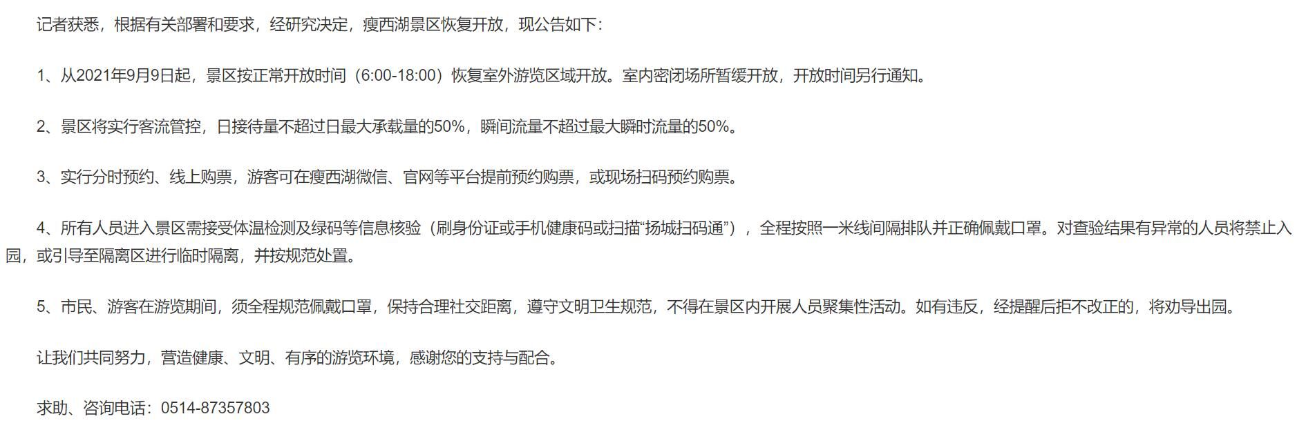 根据扬州市新冠疫情防控指挥部工作部署,经景区新冠疫情防控指挥部同意,瘦西湖风景区、宋夹城风景区、运河三湾风景区等7家A级旅游景区于今天面向社会有序恢复开放。