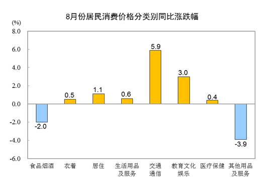 8月份,食品烟酒类价格同比下降2.0%,影响CPI(居民消费价格指数)下降约0.58个百分点。食品中,畜肉类价格下降27.1%,影响CPI下降约1.20个百分点,其中猪肉价格下降44.9%,影响CPI下降约1.09个百分点;鲜菜价格下降1.5%,影响CPI下降约0.03个百分点;蛋类价格上涨13.9%,影响CPI上涨约0.08个百分点;水产品价格上涨11.7%,影响CPI上涨约0.21个百分点;鲜果价格上涨5.0%,影响CPI上涨约0.08个百分点;粮食价格上涨0.8%,影响CPI上涨约0.01个百分点。