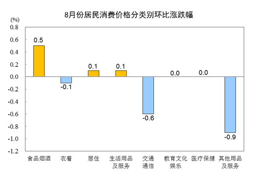 8月份,全国居民消费价格环比上涨0.1%。其中,城市上涨0.1%,农村上涨0.2%;食品价格上涨0.8%,非食品价格下降0.1%;消费品价格上涨0.2%,服务价格持平。