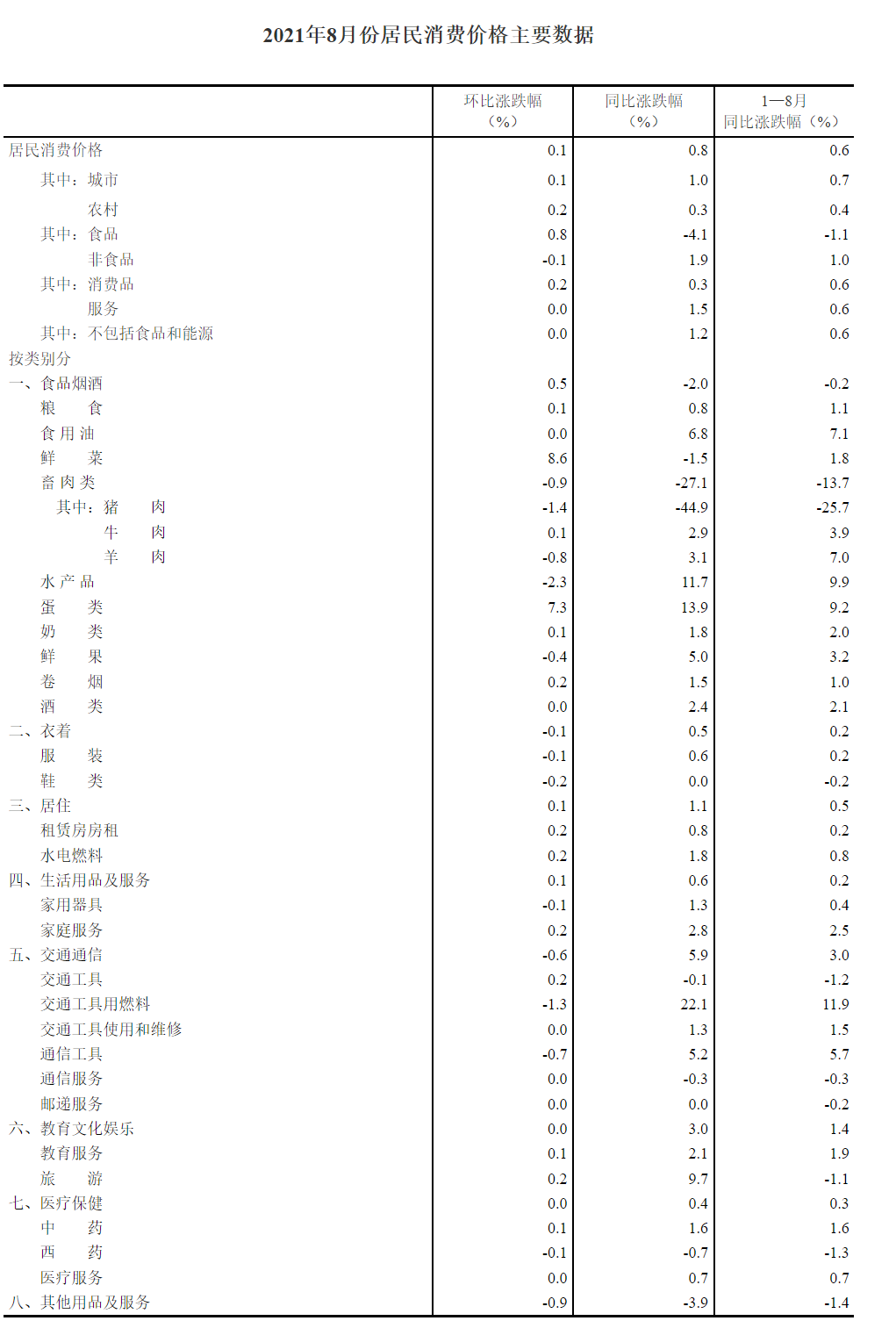 2021年8月份,全国居民消费价格同比上涨0.8%。其中,城市上涨1.0%,农村上涨0.3%;食品价格下降4.1%,非食品价格上涨1.9%;消费品价格上涨0.3%,服务价格上涨1.5%。1—8月平均,全国居民消费价格比去年同期上涨0.6%。