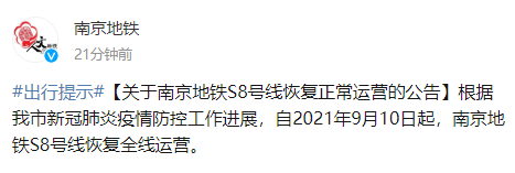 根据我市新冠肺炎疫情防控工作进展,自2021年9月10日起,南京地铁S8号线恢复全线运营。
