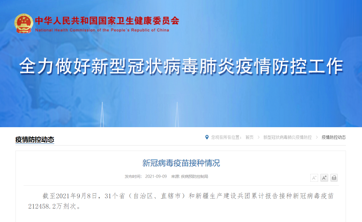 据国家卫健委网站消息,截至2021年9月8日,31个省(自治区、直辖市)和新疆生产建设兵团累计报告接种新冠病毒疫苗212458.2万剂次。