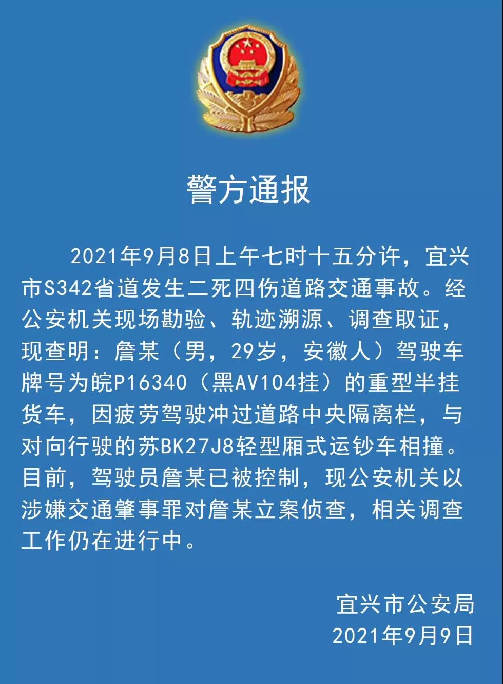 我苏网讯 9月9日,宜兴市公安局微信公众号“平安宜兴”发布通告,对9月8日S342省道发生二死四伤道路交通事故调查结果进行通报。