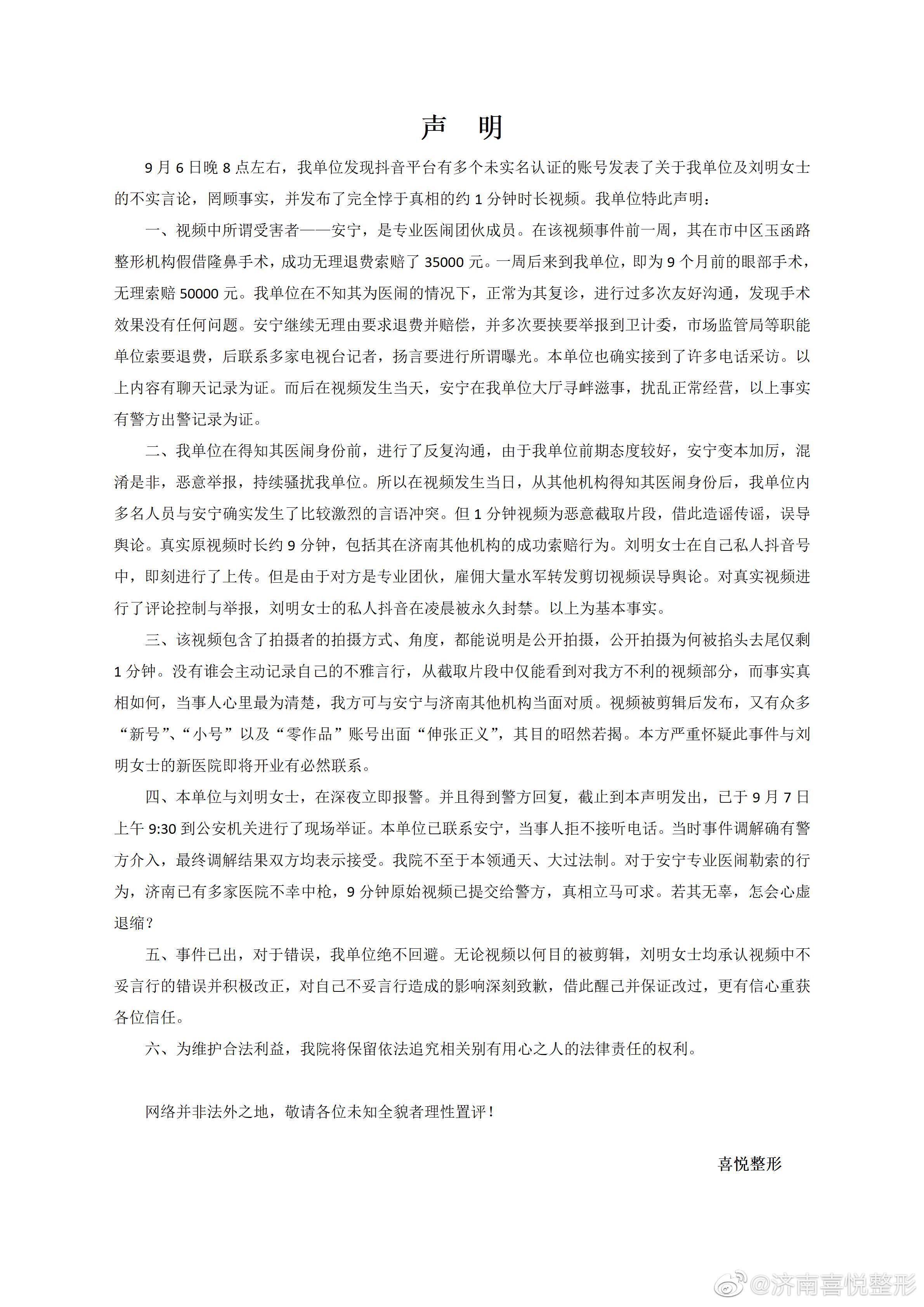 涉事济南喜悦整形医院目前已暂停营业。但是,在这之前,喜悦整形在微博上表示,对方女子是医闹成员,故意寻衅而来,对方9个月前在喜悦整形机构进行眼部手术,无理由索赔5万元,并且视频是恶意截取的片段。
