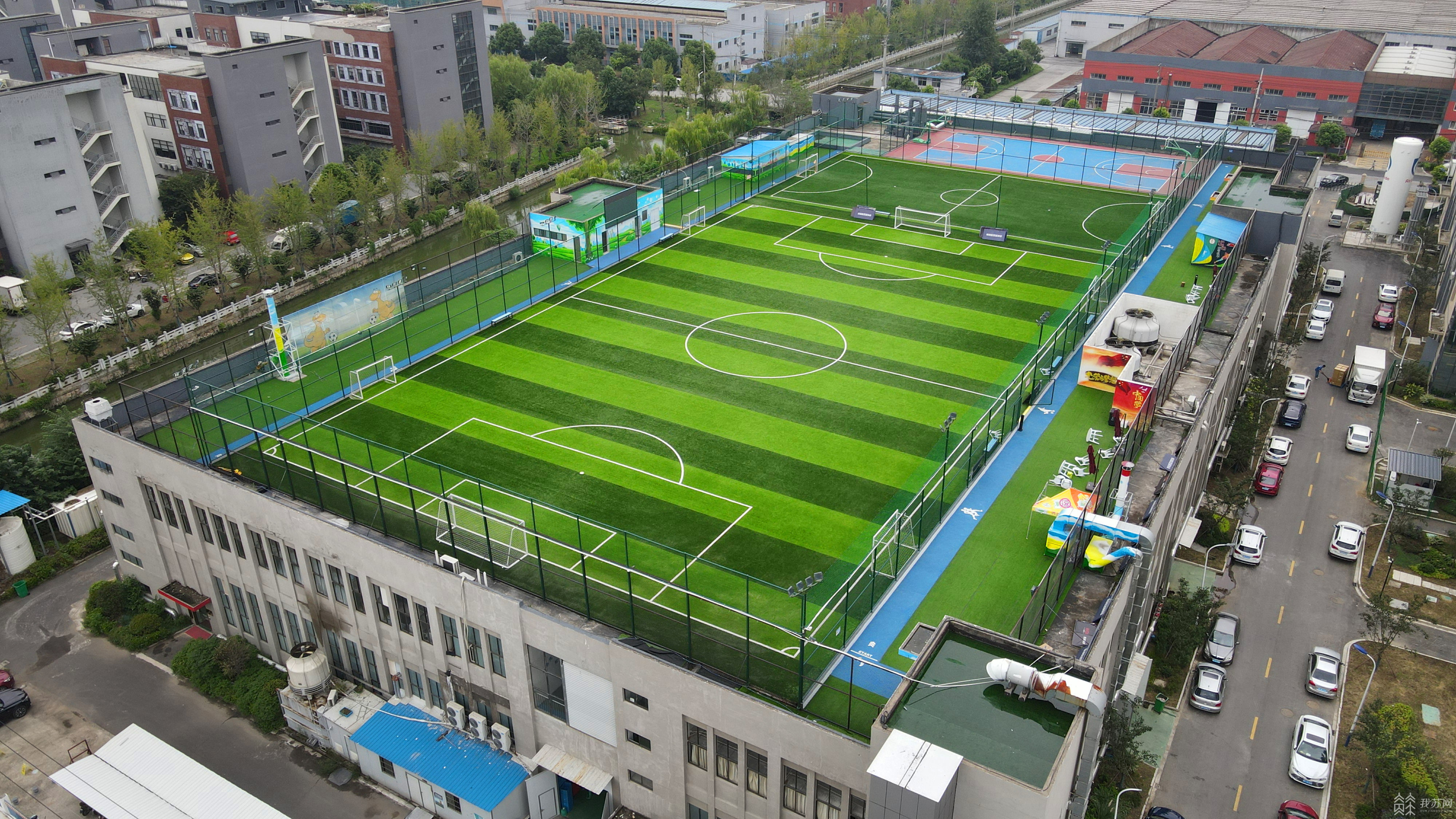 红蓝相间的塑胶篮球场、人工草坪铺设的绿茵足球场,几座漂亮的彩绘“小屋”,四周摆放着白色的休闲椅……登上无锡光电新材料科技园内一处厂房的楼顶,映入眼帘的便是一个刚刚投入使用的超级“空中运动场”,这也是无锡市梁溪区首个楼顶运动场。如今这是已经是该园区的企职工和周边居民群众运动健身的好地方。