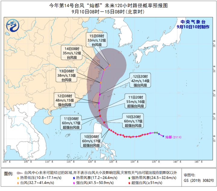今年第14号台风“灿都”(超强台风级)的中心今天(10日)早晨8点钟位于我国台湾省宜兰县南偏东方向大约880公里的西北太平洋洋面上,就是北纬17.1度、东经124.0度,中心附近最大风力有17级(60米/秒),中心最低气压为915百帕,七级风圈半径220-270公里,十级风圈半径130-150公里,十二级风圈半径70公里。