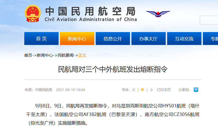 据中国民航局网站消息,9月8日、9日,民航局再发熔断指令,对乌兹别克斯坦航空公司HY501航班(塔什干至太原)、法国航空公司AF382航班(巴黎至天津)、南方航空公司CZ3056航班(仰光至广州)实施熔断措施。