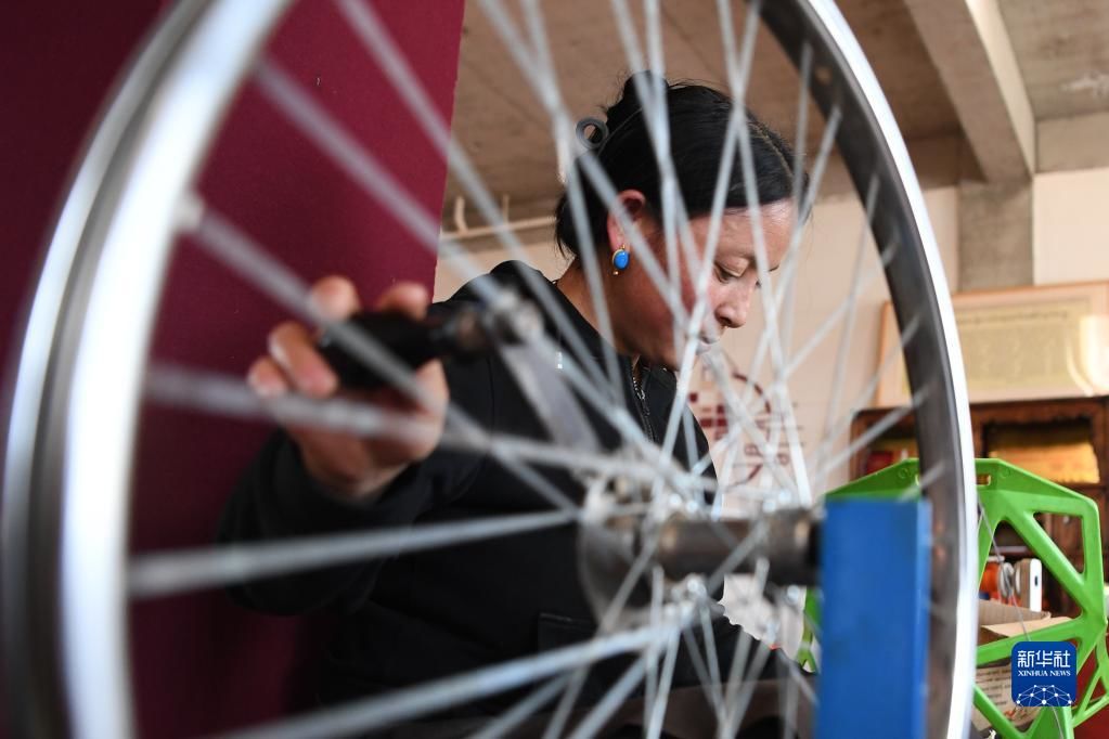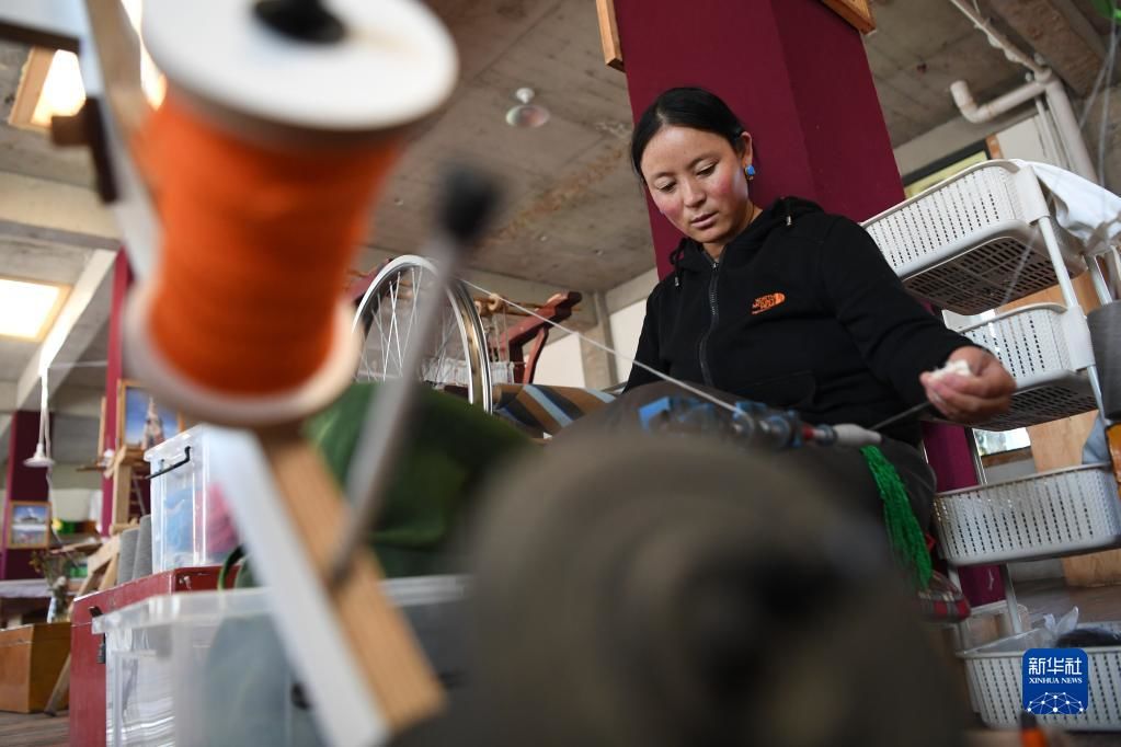 加科村村民拉周玛在藏族手工艺品车间里手工捻线(9月9日摄)。